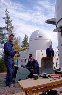 40-senttinen Meade on Tähtikallion entinen pääinstrumentti. Sen siirto tekee tilaa lähes metrisellä peilillä varustetulle Astrofoxille, joka asennetaan observatorion päätorniin nyt toukokuussa. ”Hollantilaisen Astrofoxin jalusta on tehty leveyspiirille 52. Tästä syystä jouduimme rakentamaan pilarin yläpään siten, että se on 8 astetta kallellaan”, insinööri, tähtiharrastuskonkari Juhani Salmi kertoo. ”Samalla entistä pilaria on tukevoitettu ja myös madallettu, jotta Pohjoismaiden suurin harrastuskaukoputki saataisiin ylipäätään mahtumaan tähtitorniin.”