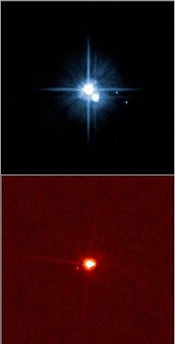 Kuvassa plutoidit Pluto (yllä) ja Eris (alla). Kummankin vieressä häämöttää yksi kiertolainen.