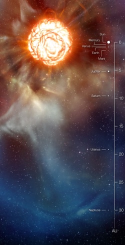 Viereisessä taiteilijan kuvassa tähdestä erkaantuva kaasupilvi on merkitty sinisellä. Kuvan reunassa on vertailun vuoksi samassa mittakaavassa kaavio omasta aurinkokunnastamme.