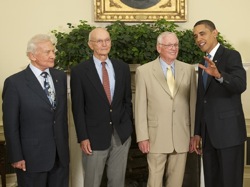 Apollo 11 -lennon kolmihenkinen miehistö koki sunnuntaina harvinaisen yhteistapaamisen Washingtonissa järjestetyssä ensimmäisen kuukävelyn 40-vuotisjuhlassa. Juhlinta ja kuulentojen muistelu jatkui kun kolmikko vieraili eilen myös Valkoisessa talossa tapaamassa Yhdysvaltojen nykyistä presidenttiä Barack Obamaa.