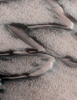 Viereisessä kuvassa näkyy erikoisia nuolenpään muotoisia dyynejä Marsin pinnalla. Tutkijat uskovat niiden syntyneen vaihtuvien tuulien ja roudan seurauksena.
