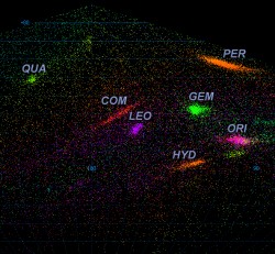 Jokainen kartan piste on yksittäisen meteorin tulosuunta taivaalla. Pisteen väri kertoo nopeudesta, jolla kappale on törmännyt ilmakehään. Esimerkiksi geminidien meteoriparvi (kartan GEM) tulee ilmakehään noin 30 kilometrin sekuntinopeudella ja leonidien (kartan LEO) nopeus on noin 70 kilometriä sekunnissa.