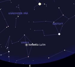 Kevään näillä näkymin paras komeetta, Lulin (C/2007), löytyy aamutaivaalta kiikarin avulla. Komeetta on tällä hetkellä Vaa’an tähdistössä ja jokseenkin suoraan etelähorisontin yläpuolella aamulla kello 6.30.