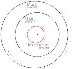 Maan, Marsin ja Merkuriuksen radat (jatkuvat viivat) verrattuina ympyröihin (pisteviivat). Kuvaajaan on merkitty myös planeettojen ratojen eksentrisyys, joka on sitä suurempi mitä kauempana ellipsirata on ympyrästä. Maan rata on hyvin lähellä ympyrää, kun taas Merkuriuksella ja Marsilla radat eroavat huomattavasti. Kuvasta puuttuvan Venuksen rata on vielä Maankin rataa lähempänä ympyrää. Kuva Bridgewater College / Richard L. Bowman