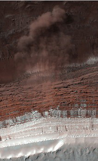 Kuvan 700 metriä korkeat kallionharjanteet ovat paikoin jyrkkyydeltään yli 60 astetta. Materiaalin on saanut liikkeelle luultavasti kevään haihduttama hiilidioksidijää. Harjanteelta putoavat kerrostumat ovat nostattaneet ilmaan noin 180 metriä paksun pölypilvirintaman.