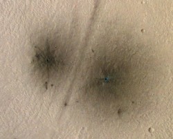 Nasan MRO-luotain on kuvannut useita hiljattain syntyneitä pieniä törmäyskraattereita Marsin pinnalta. Eräs mielenkiintoisimmista kuvista sisältää harvinaisen kaksoiskraatterien välissä olevan viivan (viereinen kuva).