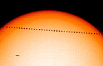 SOHO-luotain kuvasi Merkuriuksen edellisen ylikulun vuonna 2003. Kuva on koostettu useista eri otoksista. Kuva SOHO / EIT / MDI / ESA / Nasa
