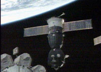 Kuvassa asemalla ennestään ollut Sojuz TMA-9, jolla Simonyi, Lopez-Alegria ja Tjurin palaavat Maahan 20.4. Kuva Nasa-TV.