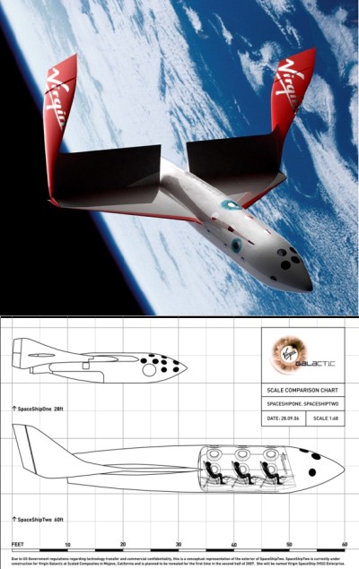 SpaceShip2 kykenee nousemaan noin 100 km korkeuteen. Pituudeltaan se on kaksinkertainen esikuvaansa SS1-alukseen verrattuna. Kuva Virgin Galactic