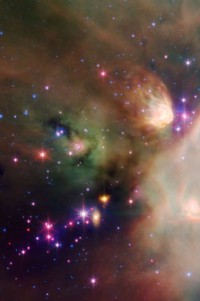 Vieressä oleva otos alueen pääkaasupilvestä kuvattiin Spitzerin tarkimmalla kameralla sekä multialueen kuvantamisfotometrillä kylmien aineiden koostumuksen analysoimiseksi. Nuorimpien tähtien ympärillä näkyvät vielä pölykiekot, jotka vähitellen haihtuvat avaruuteen tähden valon ja tähtituulen vaikutuksesta.