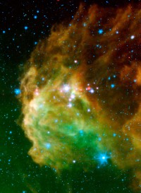 Oranssinpunertava alue kuvassa muodostuu pölyhiukkasista, jotka hehkuvat nuorten tähtien kuumentamina. Vaaleanpunaiset pisteet ovat kosmisen pölyn ja kaasun ympäröimiä nuoria tähtiä. Sinertävät tähdet taas ovat eri etäisyyksillä olevia Linnunradan tähtiä.