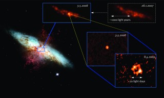 Galaksia M82 kutsutaan usein ”räjähtäväksi galaksiksi”, koska sen laita on revennyt useiden supernovaräjähdysten seurauksena. Kohde sijaitsee 12 miljoonan valovuoden etäisyydellä meistä ja on jonkin verran Linnunrataa pienempi.