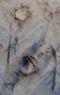 HiRISEn kuvien mukaan Marsin päiväntasaajan alueella vaikuttaa olevan suotuisat olosuhteet pölypyörteiden jälkien näkymiselle. Kuva Nasa / JPL / University of Arizona