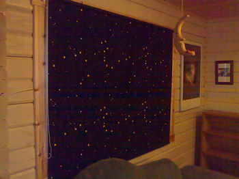 Päärakennukseen asennettu tummat tähtikuvioilliset pimennysverhot.