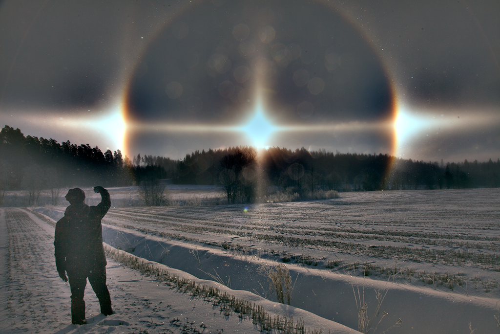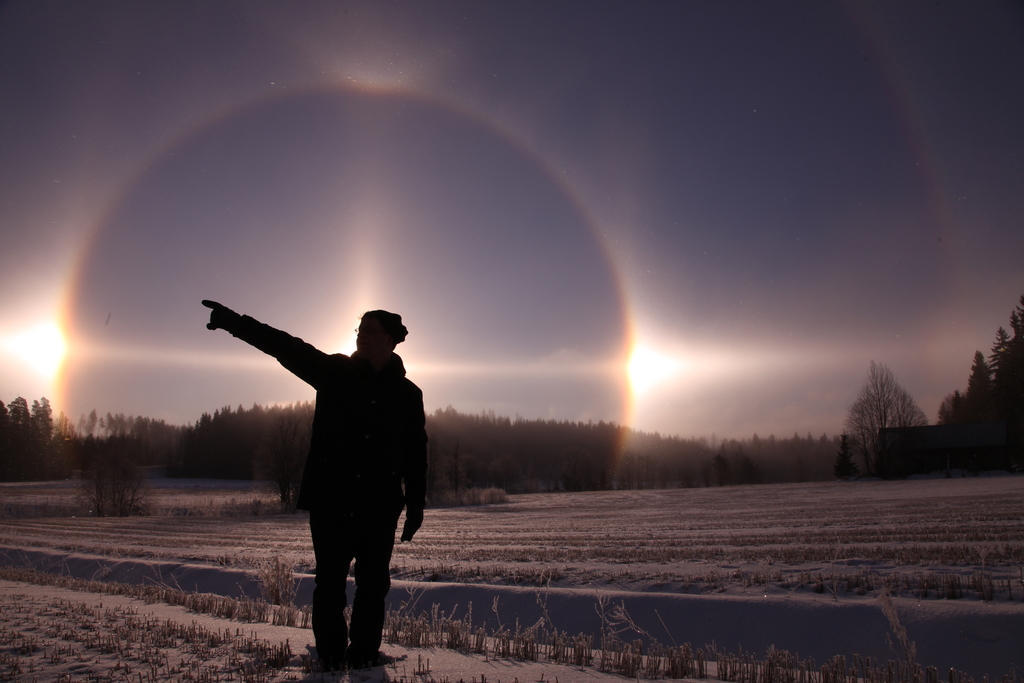 Auringon ympärillä loistivat häikäisevän kirkkaat sivuauringot. Markon ympärillä näkyy myös varsin yleinen 22:n asteen rengas, 22:n renkaan yläsivuava kaari, auringonpilari ja horisonttirengasta. Kuva Emma Herranen