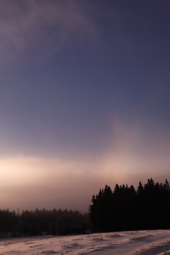 44:n asteen sivuaurinko ja 46:n asteen kaaren alku vierekkäin metsän reunan yllä. Kuva Emma Herranen.