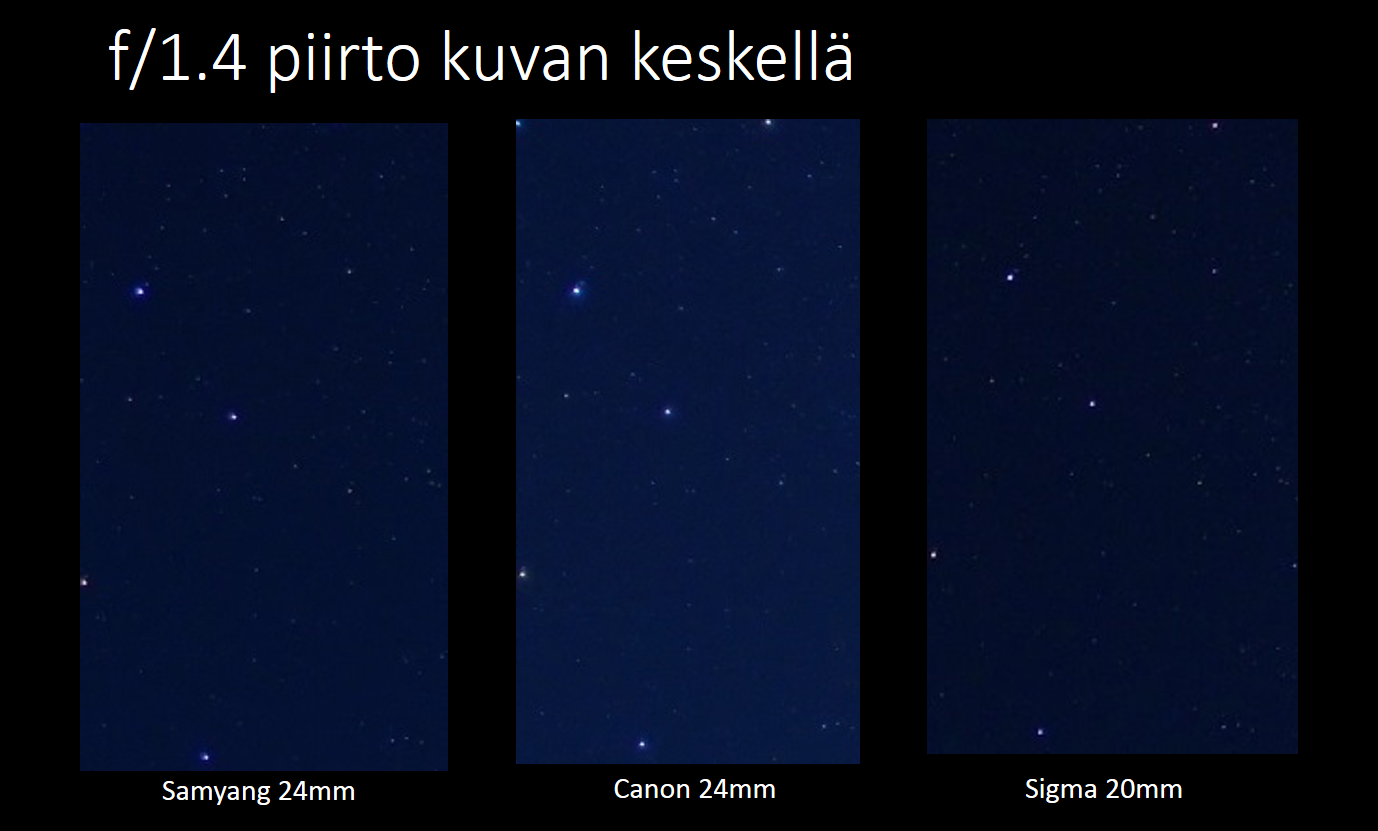 Avoimimmalla mahdollisella aukolla Sigma suoriutui hienosti kuvan keskustan osalta. Samyangin verrokilla keskiosan piirrossa vaikutti olevan pikkiriikkistä viuhkamaista komaa toispuoleisesti tähtien reunoilla. Olin kuullut monien sanovan, että Samyangin objektiivien piirto on joskus yksilötuurista kiinni. Ehkä oma koekaniinini ei ollut sieltä onnekkaimmasta päästä pakkaa.