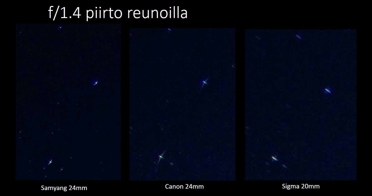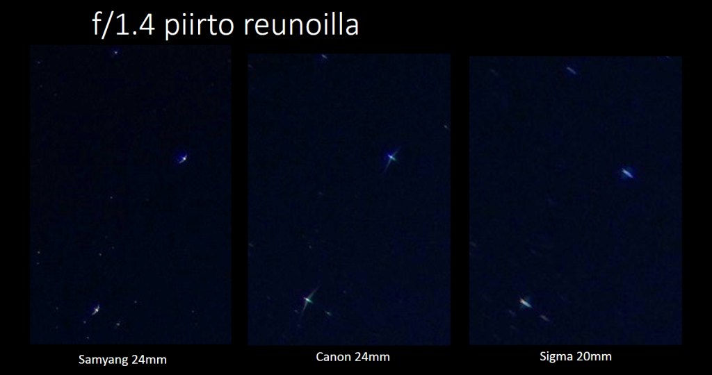Reunoja tutkiskellessa hämmästyin: vaikutti siltä, että Samyangin piirto äärilaidoissa oli joukon paras. Usean vuoden käyttökokemuksella olin jo tuskallisen tietoinen Canonin objektiivin komahaasteista kuvan reunoilla. Tähdet vaikuttivat piirtyvän voimakkaasti monisakaraisiksi vääristyneinä.