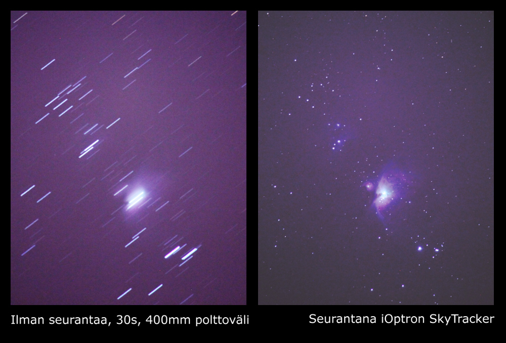 Ehdin vuoden 2013 aikana testata SkyTrackeriä kaikkiin kolmeen kiikarikomeettaan: Panstarrsiin, ISONiin ja Lovejoyhin. iOptronin uusi seurantapää soveltui täydellisesti tilapäisen komeettakuvaajan tarpeisiin. Seurannan tarkkuus antaa aavistaa, että laite on myös oiva maisemakuvaajan apu. Erityisesti maaseudun pimeydessä sillä voi saada ihmeitä aikaan.