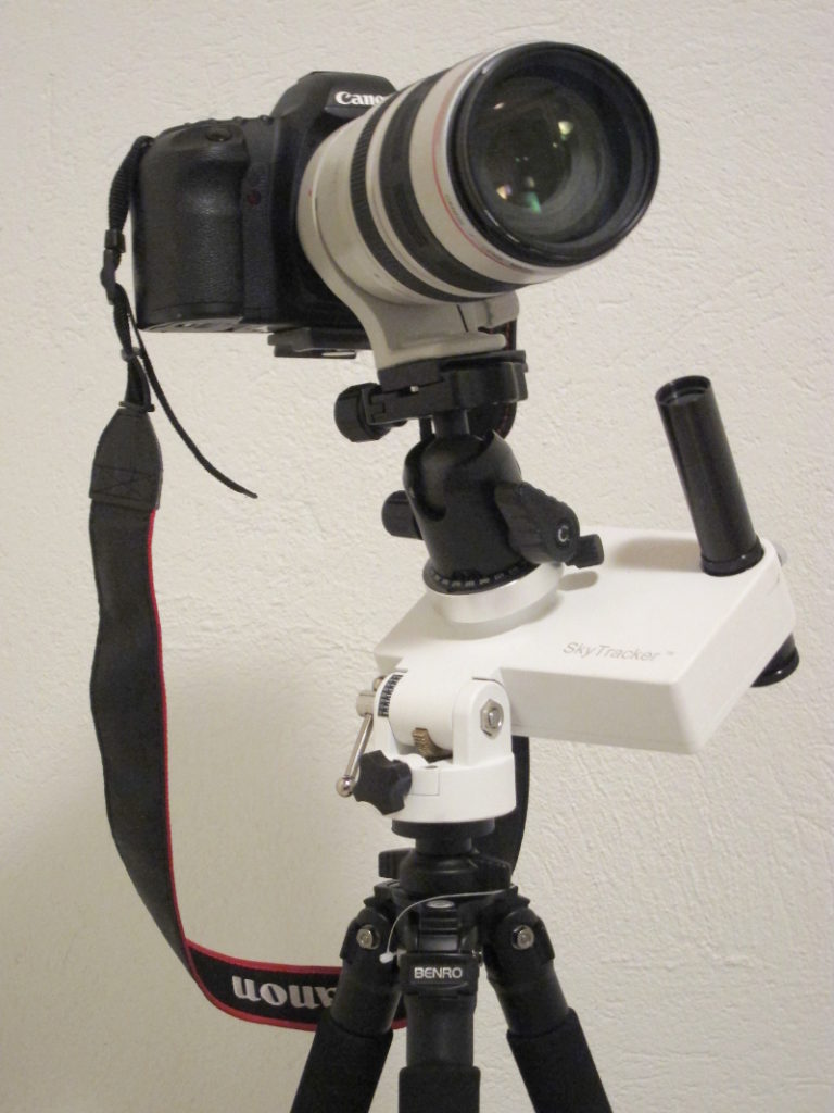 SkyTracker on kiinnitetty suoraan jalustan kierteeseen. Seuranta pyörittää jalustan kuulapään kannattelemaa kameraa. Paketissa tuli mukana myös pieni napatähtäinkaukoputki.