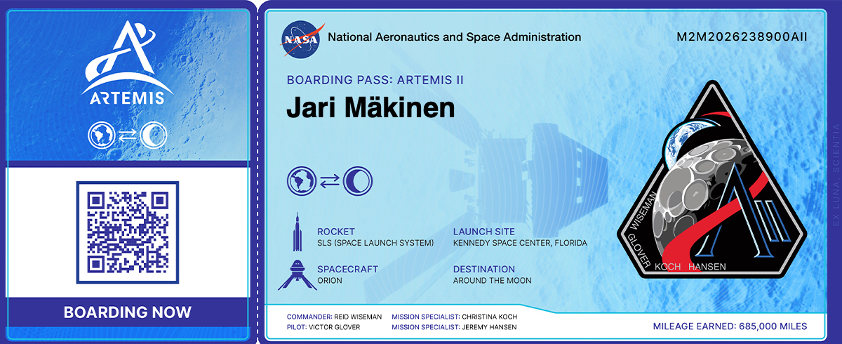 Myös sinä voit päästä mukaan lennolle, tosin virtuaalisesti. Nasalla on meneillään ”Send Your Name with Artemis II” -kampanja, jossa voit lähettää nimesi Orionin kyydissä Kuuta kiertämään. Käy lataamassa maihinnousukorttisi tammikuuhun 2026 mennessä täällä: https://www3.nasa.gov/send-your-name-with-artemis/