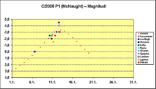 Havaitsijoilta tuli melkoinen määrä McNaught-kuvia jaostollekin ja niissä on vain jäävuoren huippu kaikista otetuista kuvista. Jo ennen Ursa Minor -jutun tekoa päivitin noita verkkoon ja nyt iltaisin olen aina pikku hiljaa lisäillyt niitä jaoston sivuille. Muutama ilta tässä menee vielä, ennen kuin olen ajantasalla.