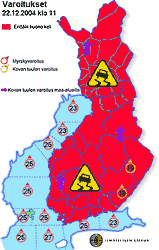 Muutamia päiviä on seurattu rajun talvimyrskyn kehittymistä pohjoisella Atlannilla. Nyt keskiviikkona 22.12. sen odotetaan iskevän Suomenkin alueelle. Ilmatieteen laitoksen varoituskartta on erittäin kuvaava, mistä myrskyssä on kyse: Etelämyrskyä 23-25 m/s merialueille ja sisämaahankin järvialueille 19 m/s. Ja keli tulee olemaan huono koko maassa.