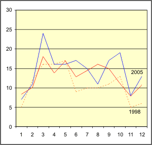 Tämänkertainen juttu tarkastelee vähän tarkemmin kahta esimerkkivuotta, 1998 ja 2005. Ohessa värillinen versio jutun yhdestä graafista. Se kertaa selkeiden öiden määrät kuukausittain Hesassa verrattuna 10 vuoden keskiarvoon (punainen viiva). Huono vuosi 1998 selittyy huonoilla kesäkuukausilla ja hyvä vuosi 2005 selkeillä maalis- ja lokakuulla.