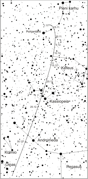 Suurin mielenkiinto kohdistuu kuitenkin 8P/Tuttleen joulu-tammikuulla. Jaksollinen komeetta lienee aika vakaa kirkkausennusteen kanssa. Komeetta kirkastuu 5,5-6,0 magnitudiin, siis liki paljaan silmän rajoille. Ehdottomasti kuitenkin mukava kiikarikomeetta. Tuttlen rata on lisäksi aika optimaalinen. Se on vuodenvaihteessa vielä aika korkealla ja katoaa vasta tammikuun puolivälissä horisontin alle.