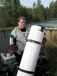 Antilla on mukava pikku ”torni” vanhempiensa tontilla pellon reunassa. Näppärä putki-jalusta-viritelmä ja suojakatos antavat varmaan hyvän havaintopaikan suhteellisen lähellä Länsi-Espoota. Paikka on itse asiassa vain muutaman kilometrin päässä Metsähovin observatorista.