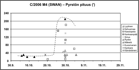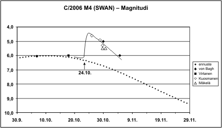 Sain Ursa Minoria varten muokattua valokäyrän ja pyrstön pituutta kuvaavan käppyrän. Komeetan 24.10. tapahtunut outbursti ja sen jälkeinen himmeneminen saatiin mainiosti havaittua meillä Suomessakin, kuten oheinen käppyrä mainiosti kertoo: