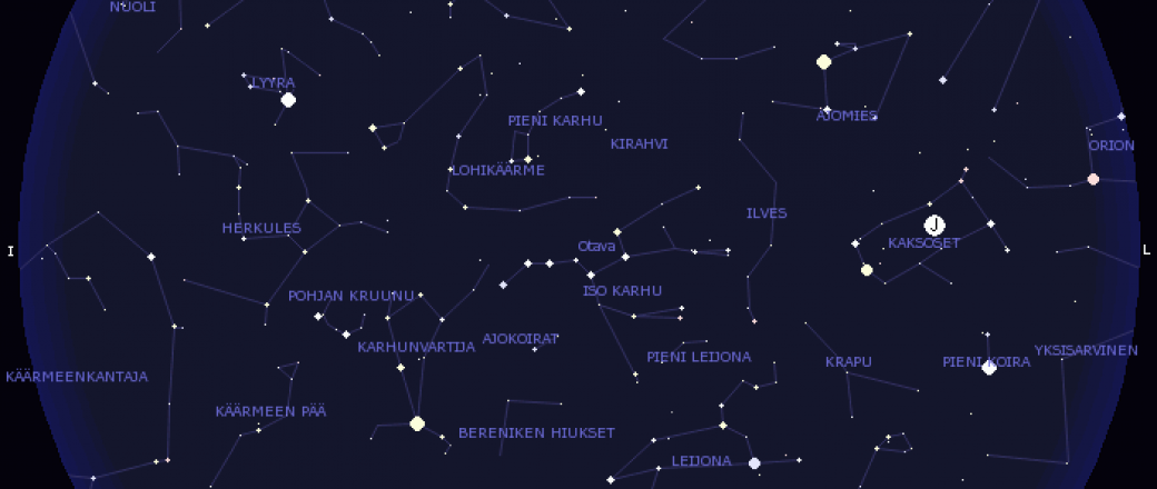 Huhti-toukokuussa taivaalla näkyvät tutut kevättaivaan tähdistöt, kuten Leijona, Vesikäärme, Neitsyt, Karhunvartija ja Herkules. Aamuyöstä taivaalle nousevat Käärmeenkantaja Käärmeineen, Vaaka sekä eteläisimmässä Suomessa myös Skorpionin yläosat. Kirkas Antares on mahdollista havaita etelärannikolta. Eteläisellä taivaalla ovat havaittavissa muun muassa Neitsyen, Bereniken hiusten sekä Leijonan suuret galaksijoukot.