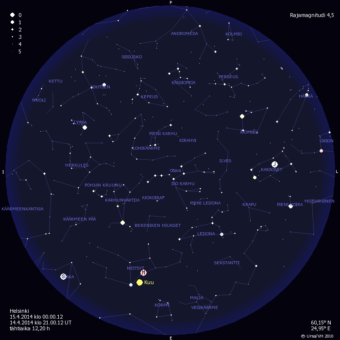 Huhtikuussa yöt lyhenevät jo nopeasti, ja tällöin on viimeiset mahdollisuudet tehdä mielekkäitä tähtihavaintoja. Täysikuu sattuu kuun puoliväliin (15.4.), mikä entisestään vähentää pimeiden öiden määrää. Helsingissä saadaan nauttia viimeisen kerran pimeästä 20./21.4., pohjoisempana Oulussa pimeät päättyvät 6./7.4. ja Inarissa jo 27./28.3. Toukokuun ensimmäisellä viikolla saadaan eteläisimmässä Suomessa nauttia vielä hetken aikaa hämärästä ennen kesän valoisia öitä.