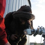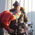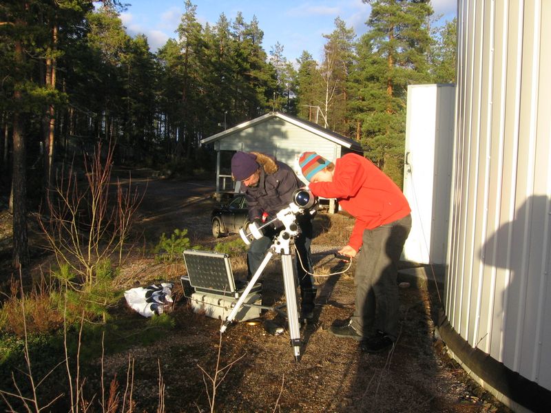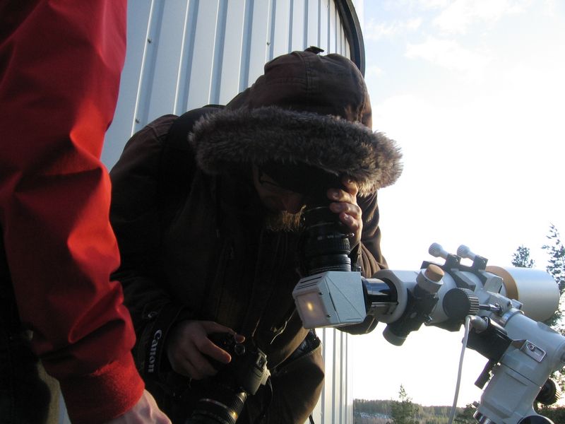 - Toni Veikkolainen katsoo Aurinkoa H-alfa-kaukoputken lävitse. Kaj Wikstedt on taustalla.
