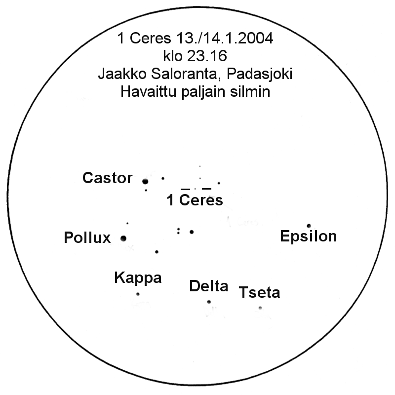 Kuva 1. Jaakko Saloranta havaitsi kääpiöplaneetan 1 Ceres paljain silmin Padasjoella 13./14.1.2004 klo 23.16.