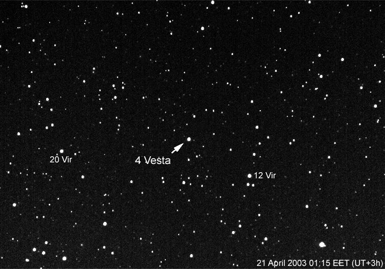 Kuva 8. Sami Martikainen kuvasi Mikkelissä asteroidin 4 Vesta 25.3.2003 klo 23 F1,8/55 mm -objektiivilla ISO 200 -filmille. Asteroidi oli Neitsyen Vindemiatrixin lähellä.