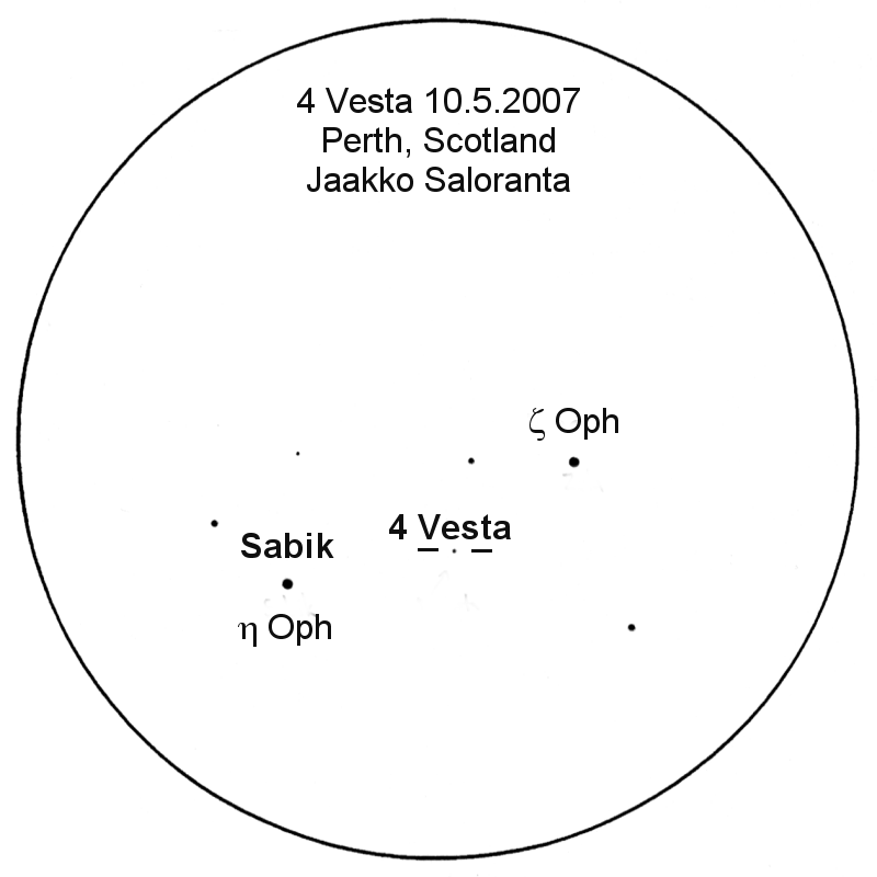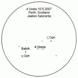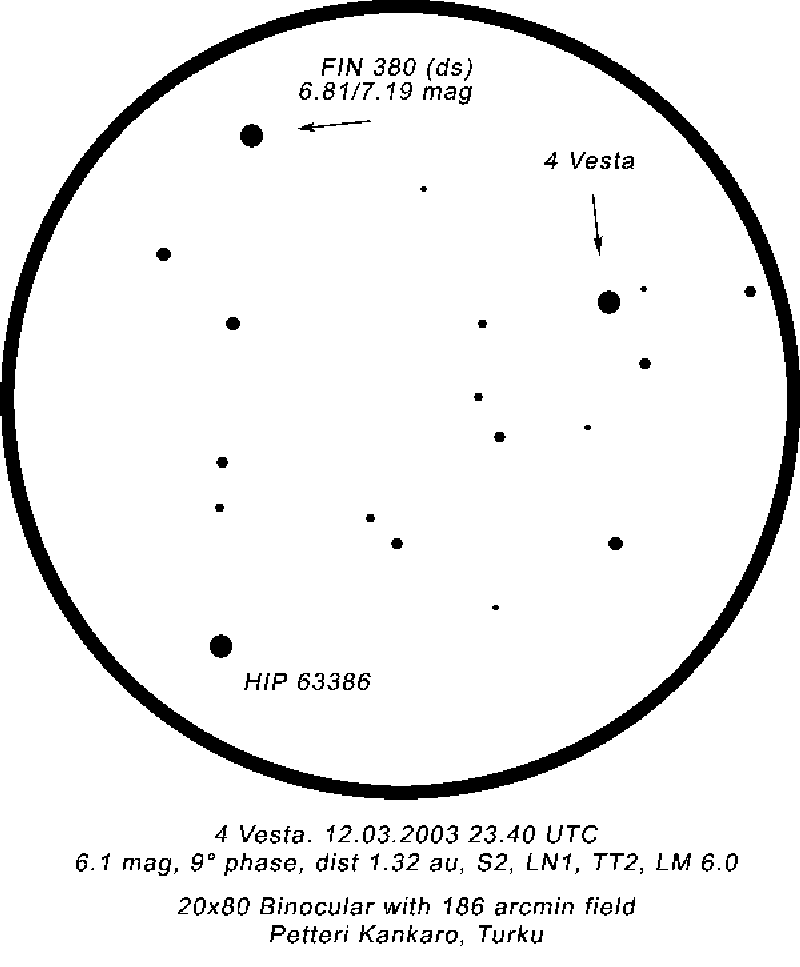 Kuva 5. Petteri Kankaro havaitsi asteroidin 4 Vesta Turussa 12./13.3.2003 klo 01.40 20 x 80 -kiikarilla.