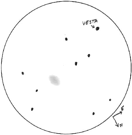 Kirjoitin Vestan paljain silmin ja muulla tavoilla tehdyistä havainnoista Ursa minorin numerossa 3/2003. Kerroin tuolloin, että kukaan ei havainnut Vestaa kaukoputkella. Löysin nyt vanhoja papereita selatessani tiedon, että kaukoputkella Vestaa havainneita oli sittenkin. Mikko Olkkonen kertoi 1.6.2003 lähettämällään sähköpostilla, että hän havaitsi Kirkkonummella Vestaa 29.3.2003 klo 22.05. (kuva 7). Piirroksen vaalea soikio on galaksi NGC 4578. Mikon havaintovälineenä oli 455/2280 Newton -kaukoputki.