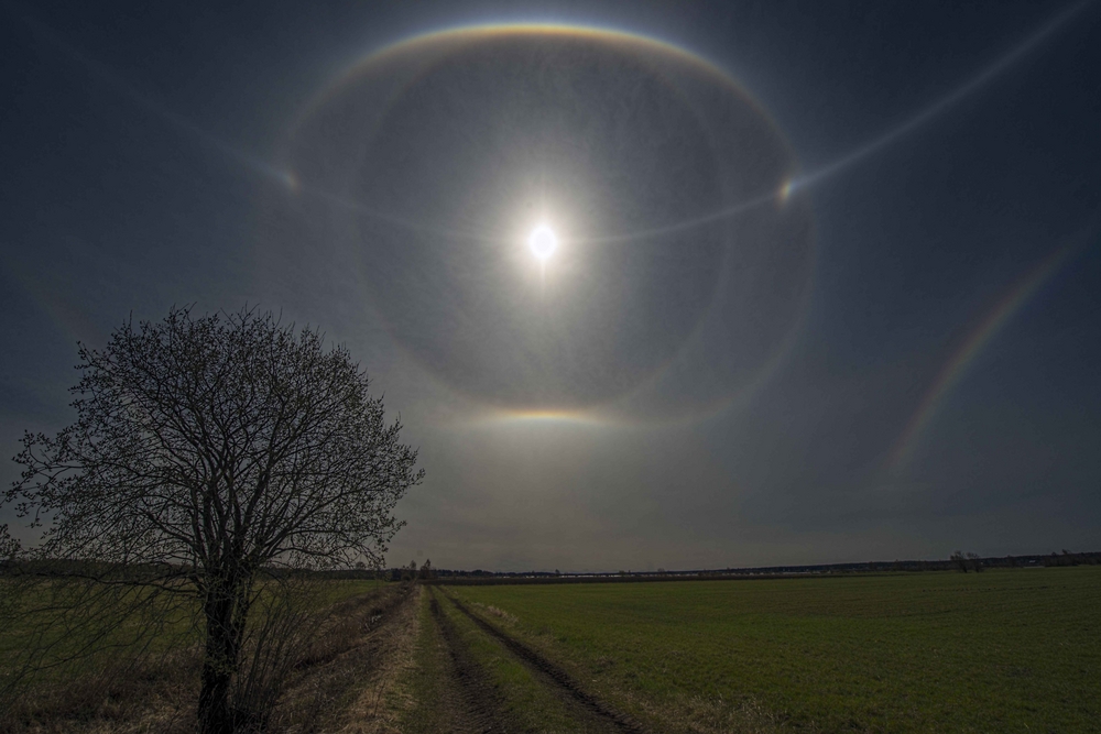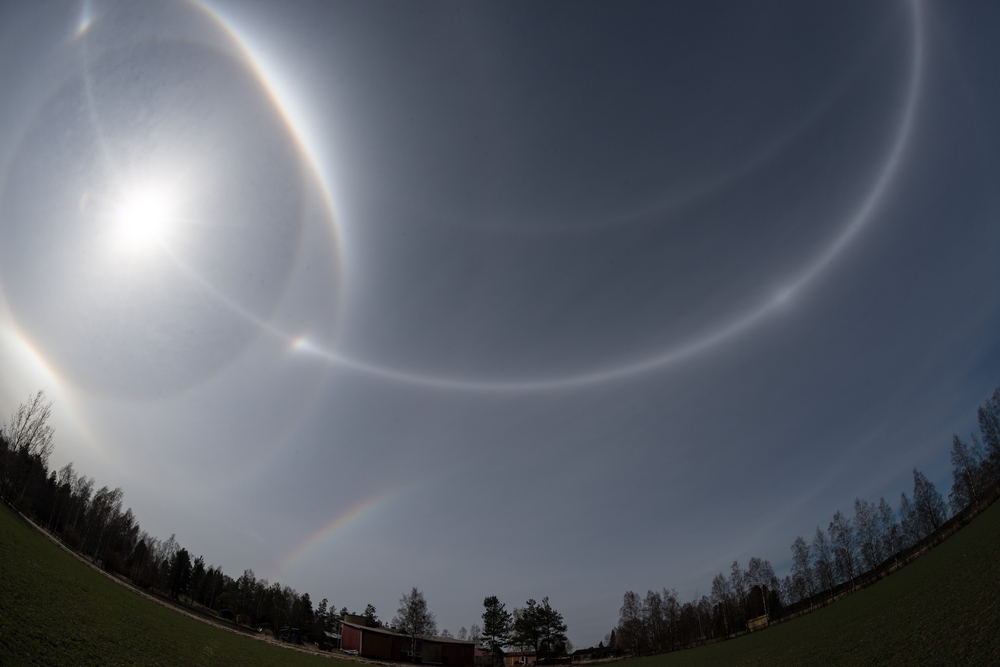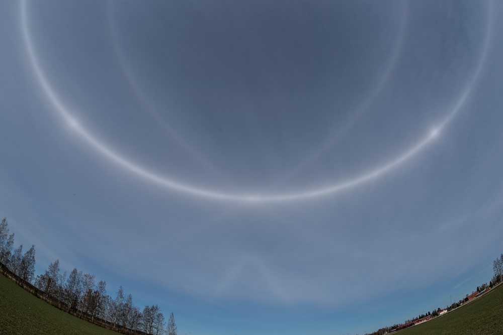 Kuva 3. Marko Mikkilän kuvassa erottuu todellisia yläpilviharvinaisuuksia: Värilliset Wegenerin vasta-aurinkokaaret lävistävät kirkkaan horisonttirenkaan vasta-aurinkopisteessä. Horisonttirenkaan alapuolelle erottuu Trickerin kaari ylösalaisena V-muotona. Sen yläpuolella sitä sivuaa ala-aurinkokaari. Kuva: Marko Mikkilä