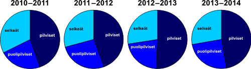 Oheinen kuva antaa jonkinlaisen yleisvaikutelman neljän talven, 2010–2011 … 2013–2014, vaihtelusta. Tietty toistuva yleiskuvio kaaviosta on huomattavissa. Alku- ja keskitalvi ovat huomattavasti pilvisempiä kuin kevättalvi. Pitkäaikaisten 17 vuoden Kelikalenteri-tilastojen perusteella marras- ja joulukuu ovat talven pilvisimpiä ja maaliskuu selvästi selkein. Tämä on nähtävissä myös edellä olevasta kuvasta.