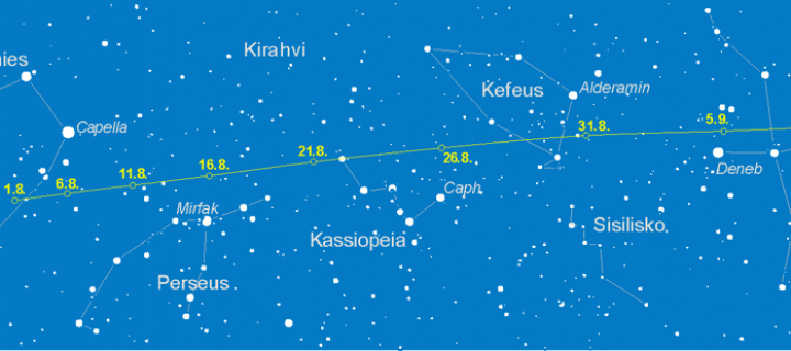 Elokuun aikana komeetta liikkuu Ajomiehestä Perseuksen kautta Kassiopeiaan. Perseidien aikoihin C/2014 E2 (Jacques) on Perseuksen itäreunalla radiantista alavasemmalle. Elokuun lopulla komeetta Kefeuksessa ja syyskuun alussa Joutsenessa Denebin ja Sadrin lähellä.