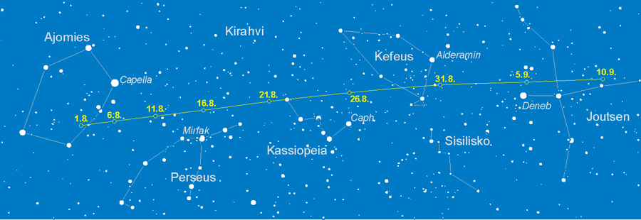Komeetan C/2014 E2 (Jacques) rata 1.8.–10.9. viiden päivän välein. Paikat ovat klo 00 Suomen aikaa. Napsauttamalla karttaa saat sen hiukan suuremmassa koossa.