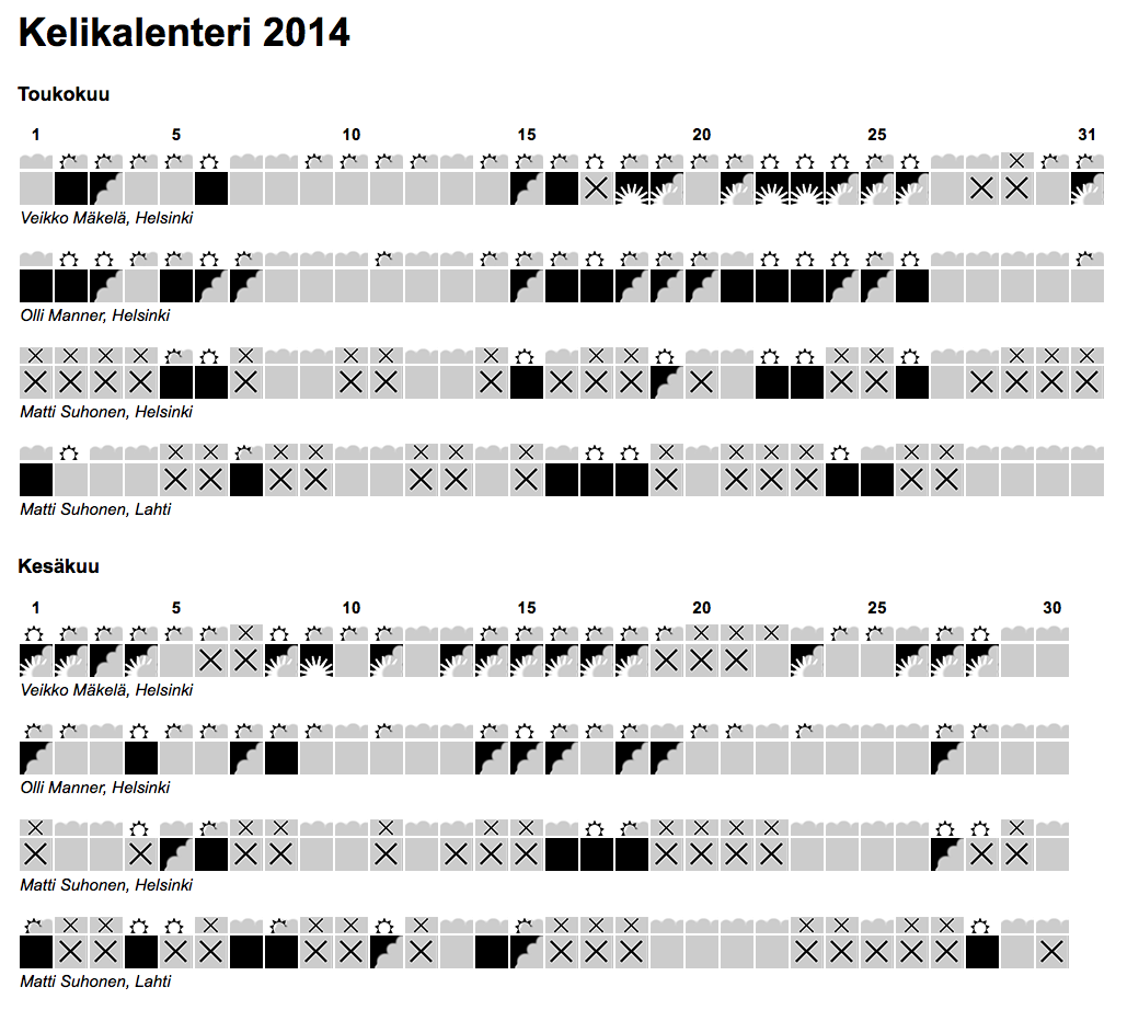 Kelikalenteri: touko-kesäkuu 2014 Sää ja havainto-olosuhteet 4.8.2014 0 Klikkaa kuvaa saadaksesi kalenterin auki varsinaisessa koossa. Kelikalenterin toteutus: Ilkka Santtila.