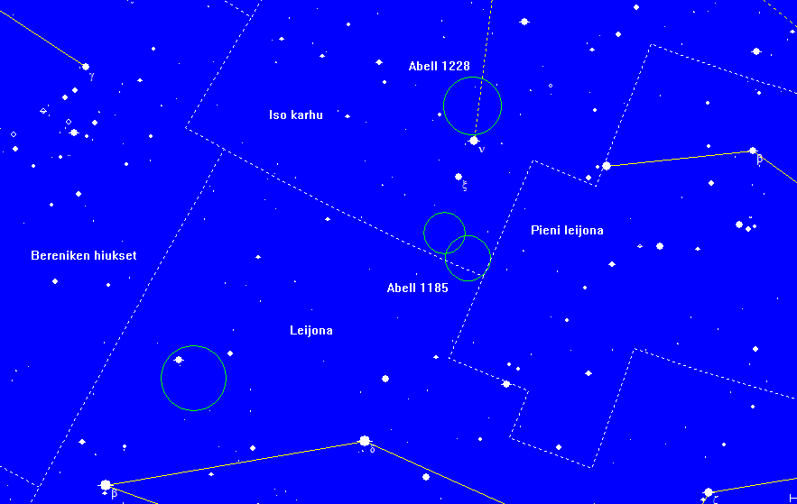 Kuva 2. Kuvassa on esitetty eräiden Herkuleen superjoukkojen merkittävimpien galaksijoukkojen sijainti taivaankannella (Kuva: Juha Ojanperä, Skymap Pro).