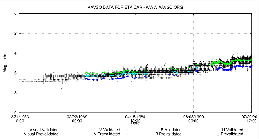 Eteläisellä taivaalla Kölin (Carina) tähdistössä sijaitseva Eta Carinae -tähti on kirkastumassa. AAVSO:n havaintojen mukaan tähti on nyt kirkkaampi kuin koskaan vuoden 1863 jälkeen! Nyt tähden kirkkaus on noin 4,5 magnitudia.