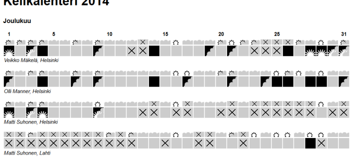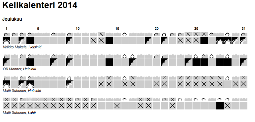Kelikalenteri joulukuu 2014 Sää ja havainto-olosuhteet 22.2.2015 0 Klikkaa kuvaa avataksesi kelikalenterin täyskokoon. Kelikalenterin toteutus: Ilkka Santtila