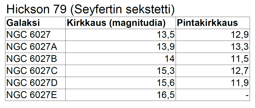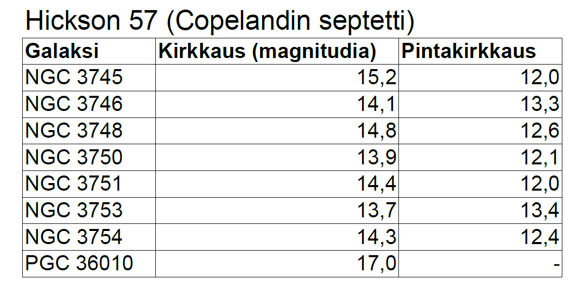 Kaukoputken omistajilla on hyvät mahdollisuudet seurata Hicksonin jalanjäljissä ja samalla päästä kokeilemaan sekä omia taitojaan että kaukoputken tehoja kolmeen ehkä tunnetuimpaan kevättaivaan Hickson-kohteeseen. Näitä ovat The Box (Hickson 61), Seyfert’s Sextet (Hickson 79) ja Copeland’s Septet (Hickson 57). Pystytkö metsästämään nämä kaikki kolme ja millä instrumentilla? Hicksonien maailmaan piirroksien avulla meidät johdattaa Stella Arcti-palkittu syvän taivaan maestro Iiro Sairanen.