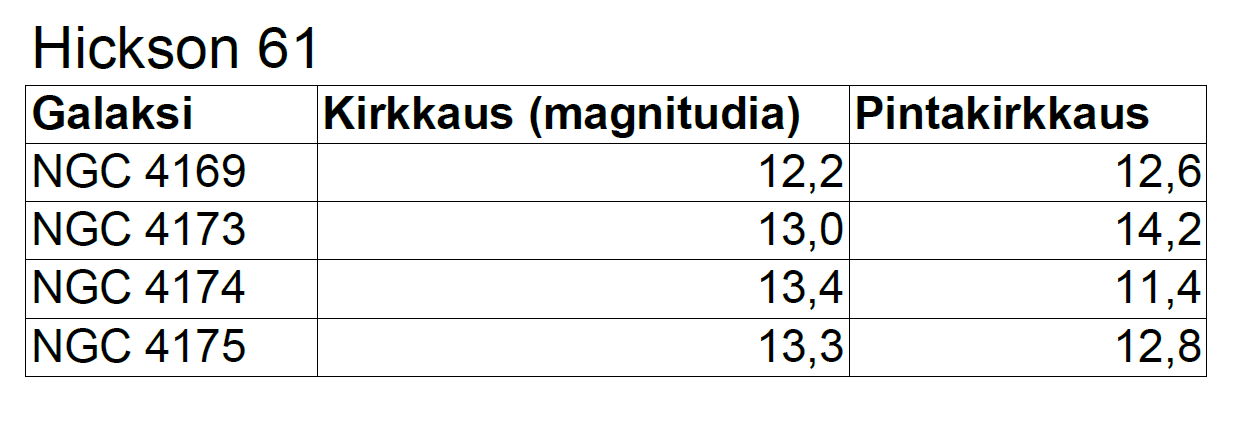 Bereniken hiuksien (Coma Berenices) pohjoisosissa majaileva Hickson 61 on kolmikosta helpoin kohde. Kiikareilla sitä ei kuitenkaan kannata lähteä etsimään: kirkkain joukon galaksi on vain magnitudia 12. Lempinimen “Laatikko” (The Box) saanut galaksiryhmä sisältää 4 galaksia, jotka muodostavat lähes symmetrisen suorakulmion eli laatikon. Yksi galakseista (NGC 4173) on etualan kohde, mutta loput kolme ovat samaa poppoota. William Herschel löysi kaikki neljä galaksia 44-senttisellä kaukoputkellaan vuonna 1785 .