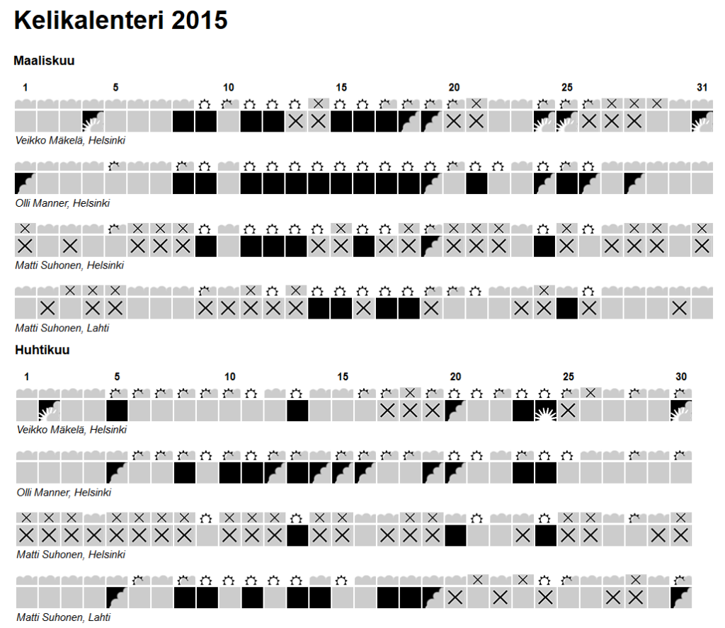 Kelikalenteri maalis-huhtikuu 2015 Sää ja havainto-olosuhteet 13.7.2015 0 Klikkaa kuvaa avataksesi kelikalenterin täyskokoon. Kelikalenterin toteutus: Ilkka Santtila