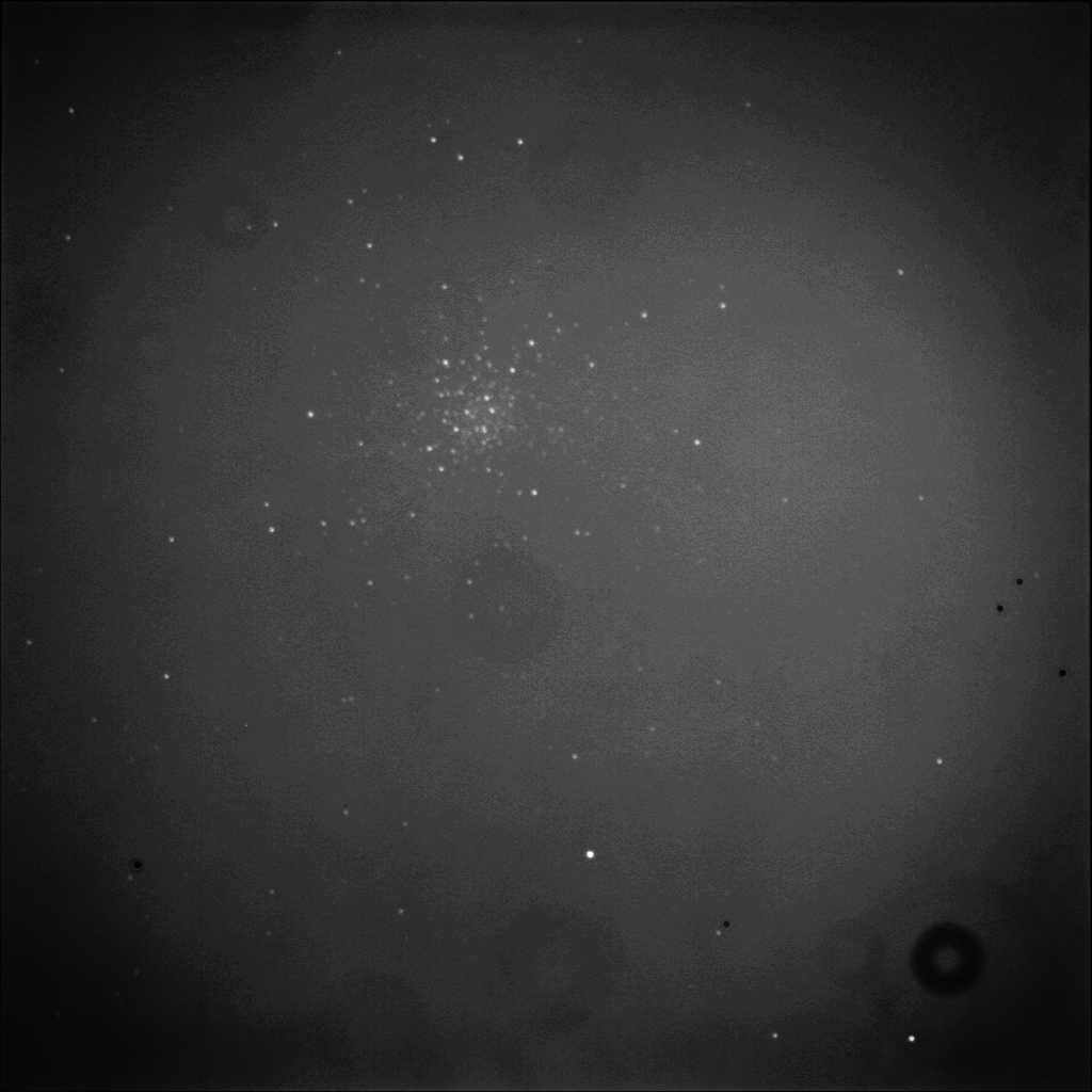 Oheinen, lähes käsittelemätön koostekuva M10:stä tarjoaa koruttoman näyn kohteesta. Käytetylle suodattimelle ei ollut käyttökelpoisia flättejä, joten kuva kertoo lahjomattomasti valon väylälle osuneista roskista ja valon jakautumasta kennolle. Taustavalon ja tähtien vähäinen kirkkaussuhde ilmenee taustataivaan sävyn porrastumisena.